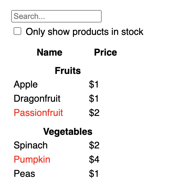 • ProductTable needs to filter the product list based on that state (search text and checkbox value).